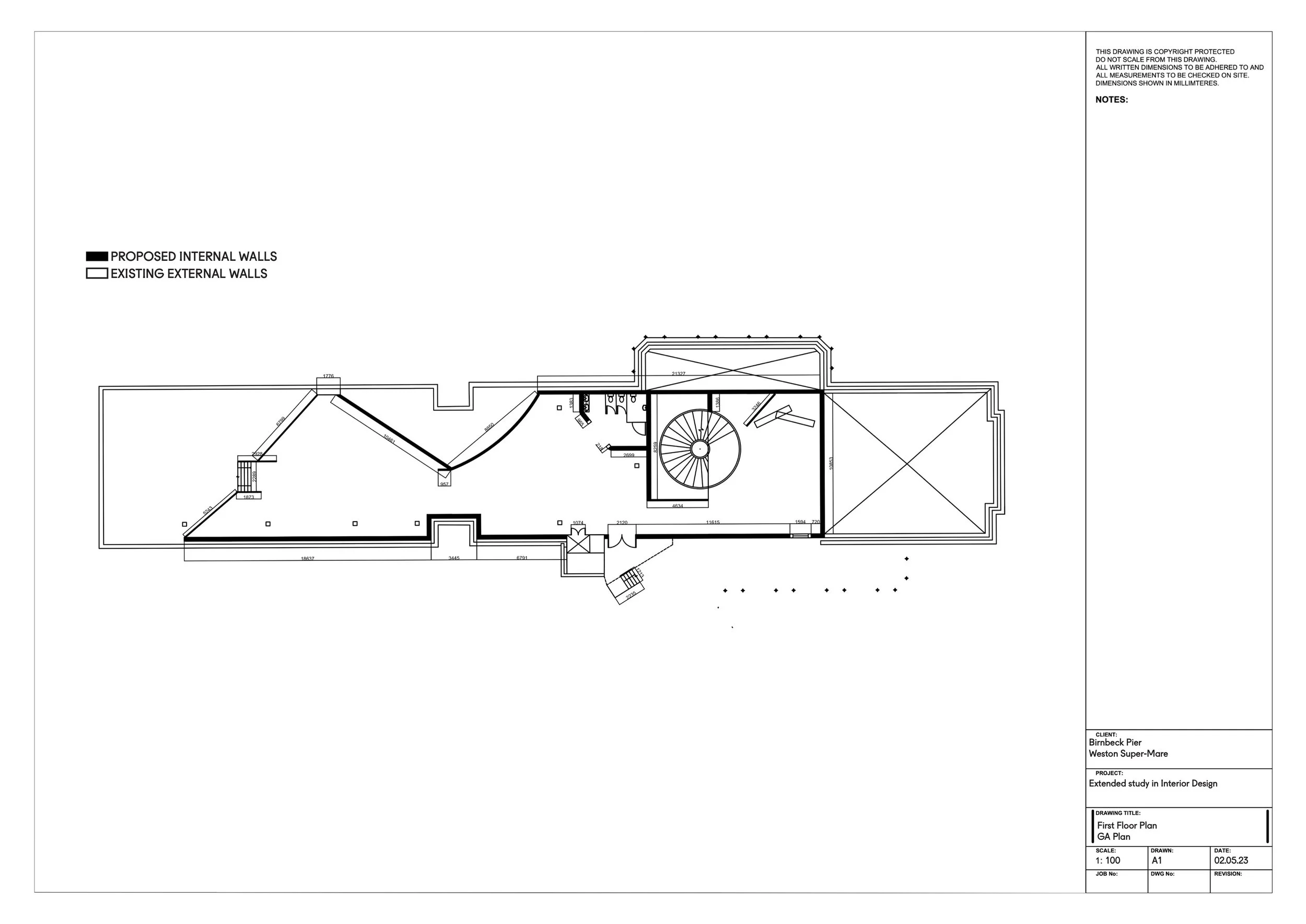 Birnbeck Pier is a site that has faced years of neglect, failed fundraisers and empty promises. My proposal focuses on turning the site into a creative and cultural hub, offering tourists and locals entertainment facilities and social settings. The structure of the building is built around an inner core, otherwise called the ‘spine’, which is a deconstructed version of the decaying pier. The ‘spine’ runs through the building offering confusing yet dynamic spaces, that appear as features such as walls and seating.